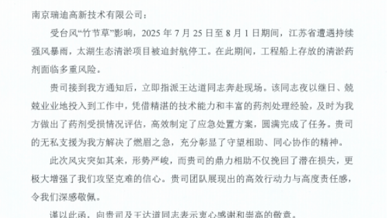 南京瑞迪高新技術有限公司緊急馳援中交天航局太湖項目部